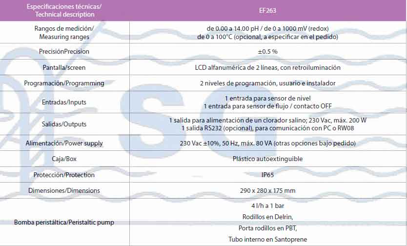 El sistema compacto EF263 es fácil da instalar (en pared) y mantener, y permite gestionar el análisis y el ajuste de los niveles de pH y cloro en las piscinas.