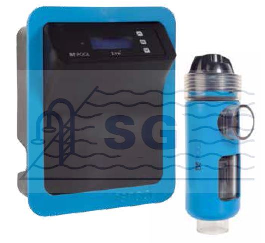 Clorador salino compacto en caja IP65 con display digital y producciones de 15, 25 y 35 gramos destinados para piscinas privadas.