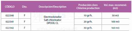 Equipo de cloración salina de últi-mo diseño y alto rendimiento, ya que funciona con tan sólo 3gr. de sal por litro de agua. Tamaño reducido, ideal para es-pacios pequeños. Célula totalmente des-montable para su fácil limpieza.