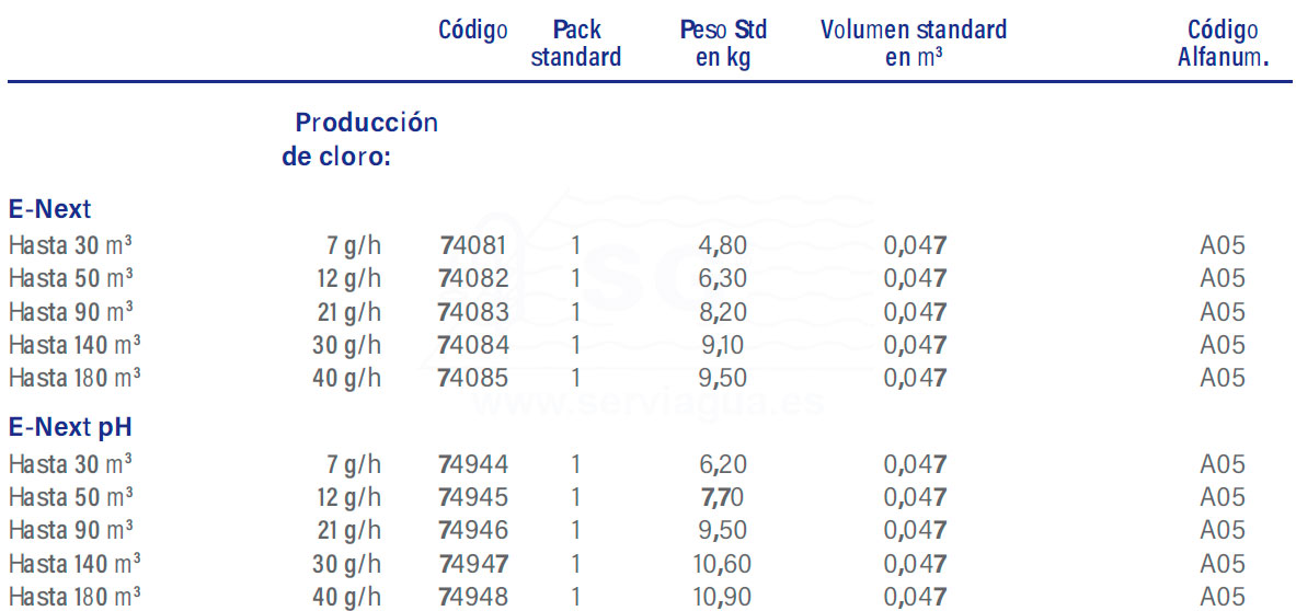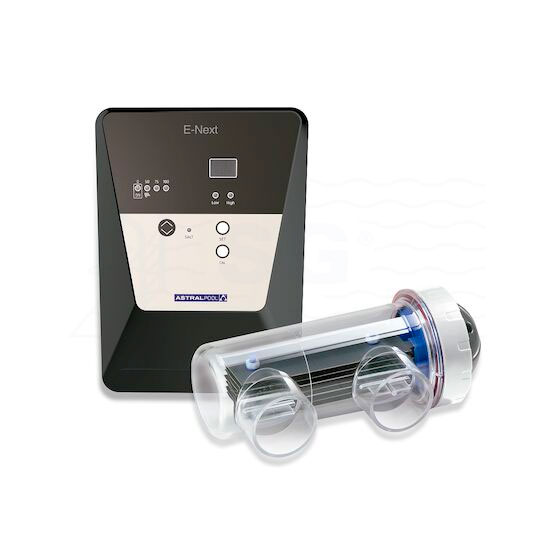 El sistema de electrólisis de agua salada E-Next puede tratar piscinas de hasta 180 m3. Desinfeca automáticamente y reduce la producción de cloro si la piscina cuenta con una cubierta automática (contacto seco específico).