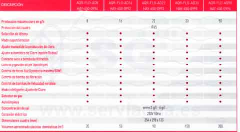 Distintos equipos para producción adaptada al tamaoñ de las piscinas domésticas: 8 - 16- 22- 33- 59 g/h