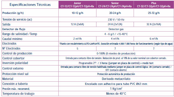 Especificaciones ténicas de los electrocloradores Sprint Chlore: