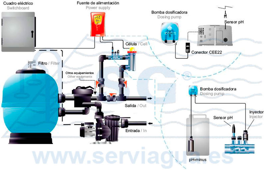 - Para el buen funcionamiento de la electrólisis, el pH de la piscina debe mantenerse en 7,2 y 7,4.