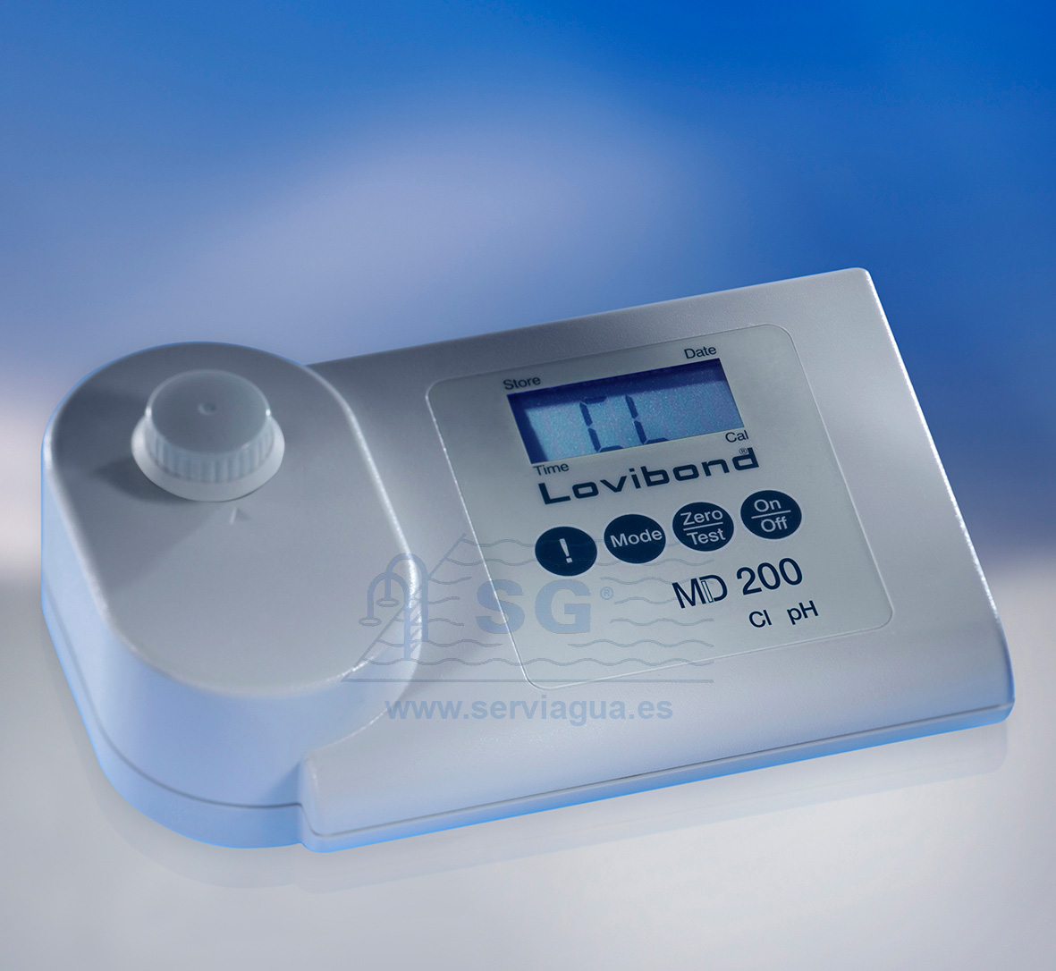 Fotómetro MD200 6 en1 para medir Cloro, bromo, pH, ácido cianúrico, Alcalinidad, total (M) y dureza calcica 0,01 - 6,0 mg/l Cl2 / 0,1 - 10 mg/l Cl2; 0,05 - 13 mg/l Br ; 6,5 - 8,4 pH; 2 - 160 mg/l ácido cianúrico ; 5 - 200 mg/l CaCO3; 0 - 500 mg/l CaCO3 (CaH).