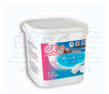 Tratamiento de mantenimiento: con el pH del agua ajustado, añadir 1 tableta de CTX-392 multiAction 250 gr por cada 25 m³ de agua cada 7 días.