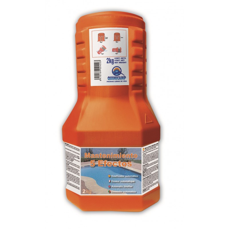 Con un solo producto. Cloración del agua. Evita algas y bacterias. Flocula y clarifi ca el agua. El envase es el dosificador. Fácil y cómodo de utilizar. Tratamiento completo y contínuo. Larga duración del producto. No intente abrir o rellenar este cartucho (irrellenable).