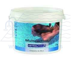 Compuesto sólido en tabletas, especialmente formulado para que con su sola aplicación en el agua de la piscina se consiga eliminar las bacterias, virus y microorganismos en general; evitar el desarrollo de las algas y mantener transparente y cristalina el agua.