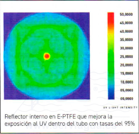 · Reflector interno en E-PTFE muy superior a los reflectores tradicionales de INOX (hasta 95% para el E-PTFE contra solo 28% para el INOX) - una mayor exposición de los microorganismos al UV.